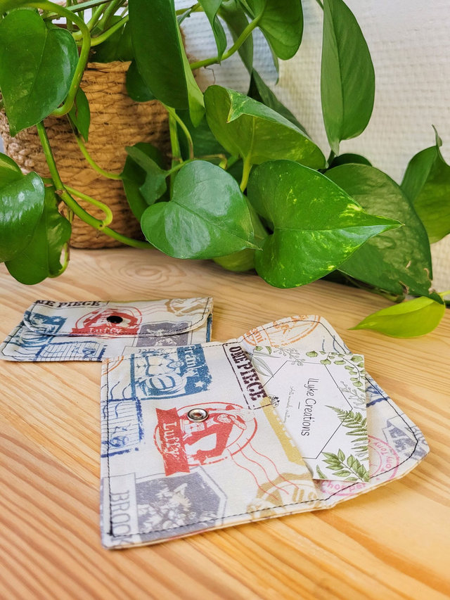 Porte-cartes en tissu, se fermant à l’aide d’un bouton-pression (couleur aléatoire) afin de maintenir vos cartes en place.